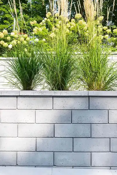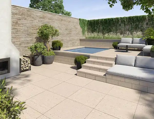 Travertina Raw Walls feature Brushed Travertine texture in Dry Cast concrete with a double-sided design, ideal for retaining walls, planters, benches, and outdoor kitchens.